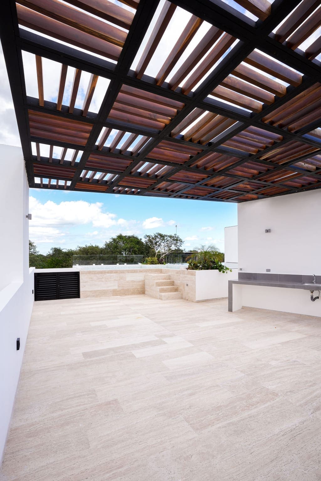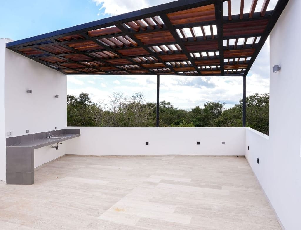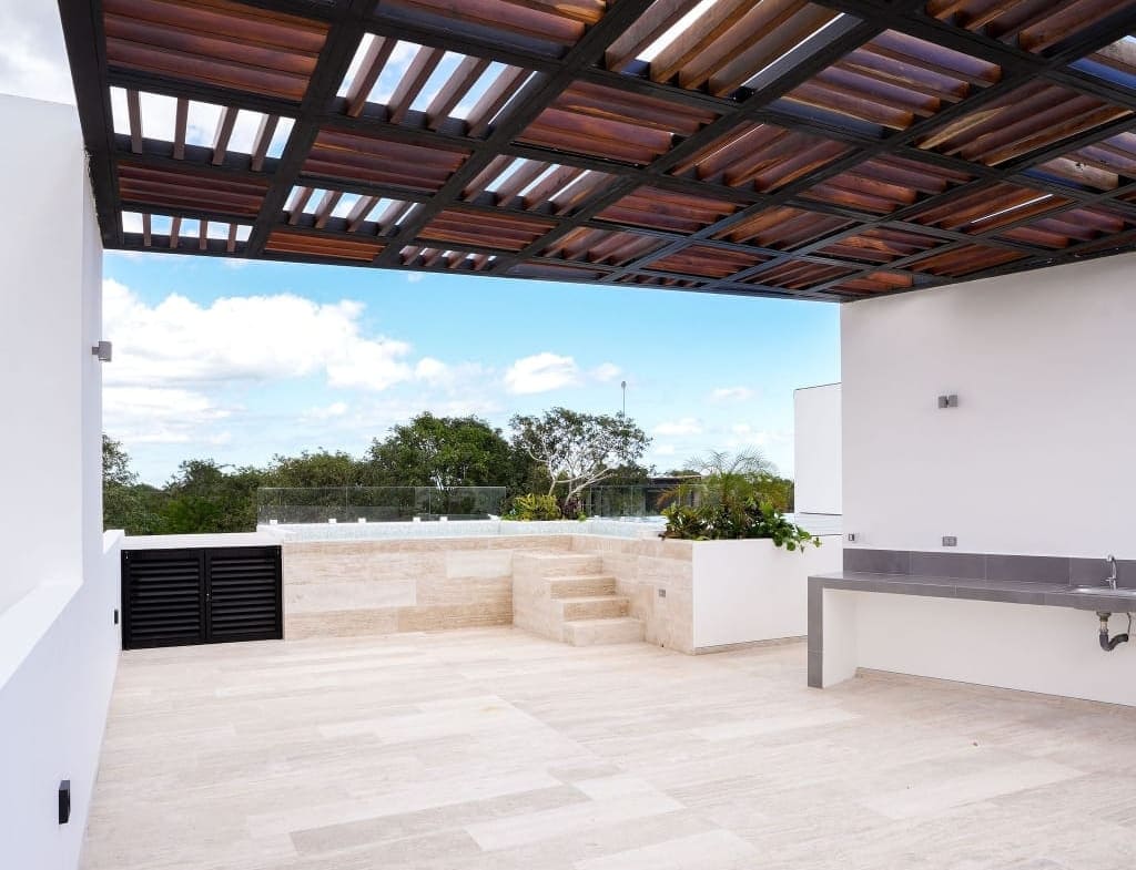 Iluminación natural, ventilación cruzada, cocina equipada, carpintería de calidad y áreas exteriores pensadas para el clima del Caribe. El roof top con alberca se convierte en el corazón social de la casa: cenas al atardecer, asados y reuniones con amigos con total privacidad.