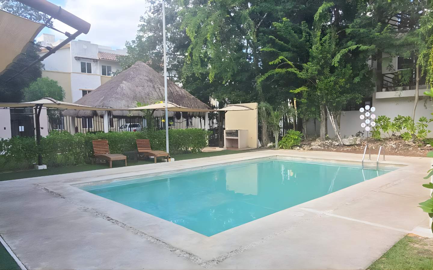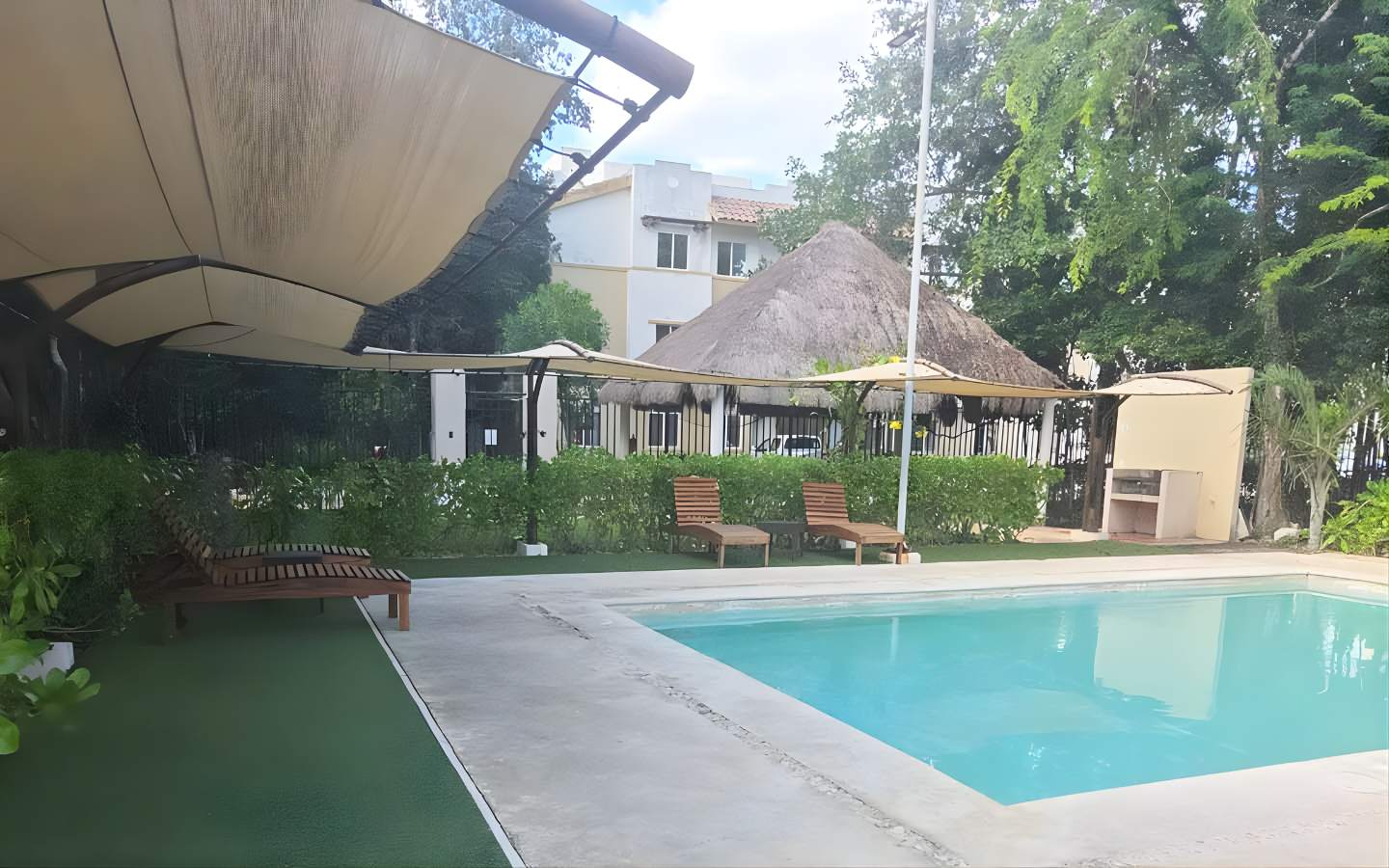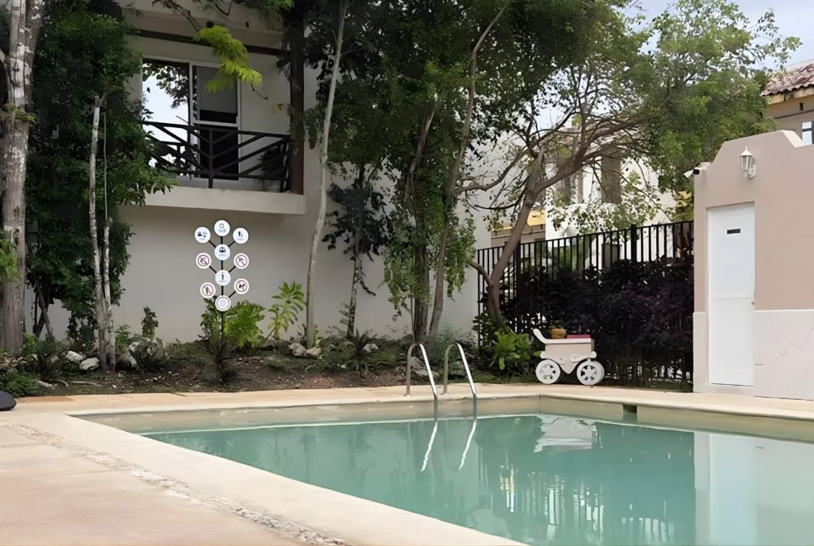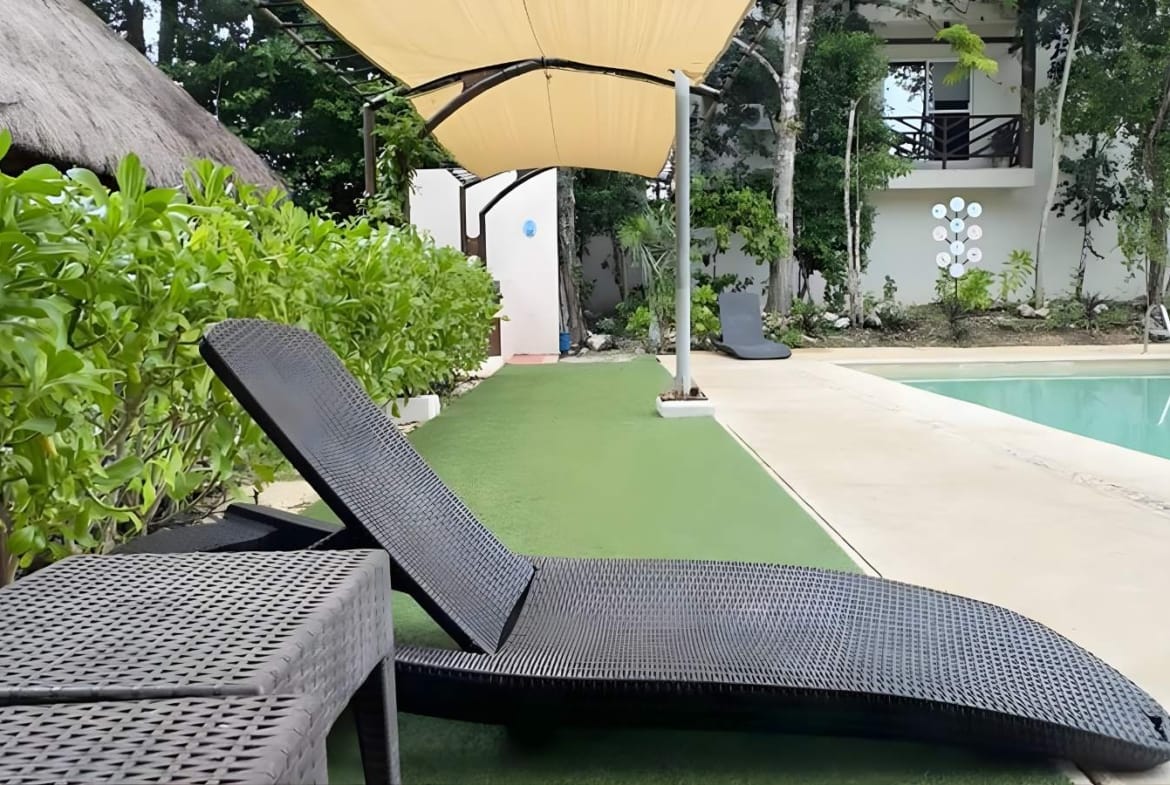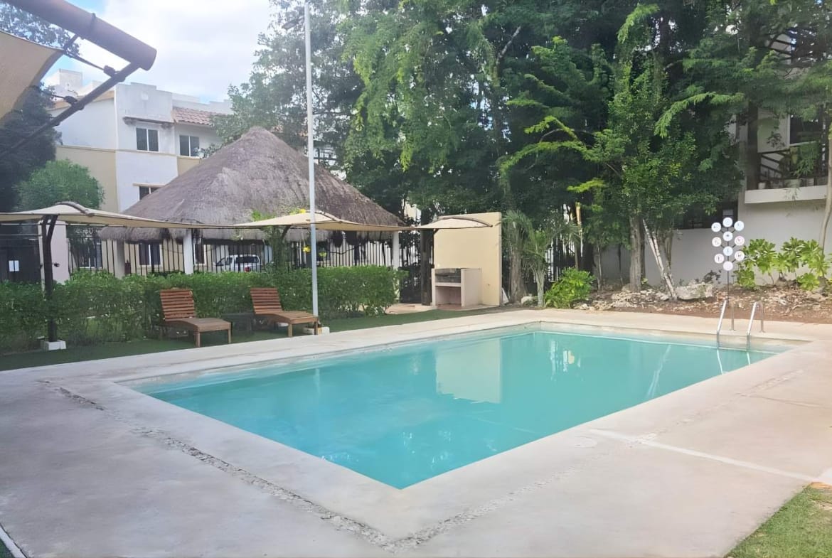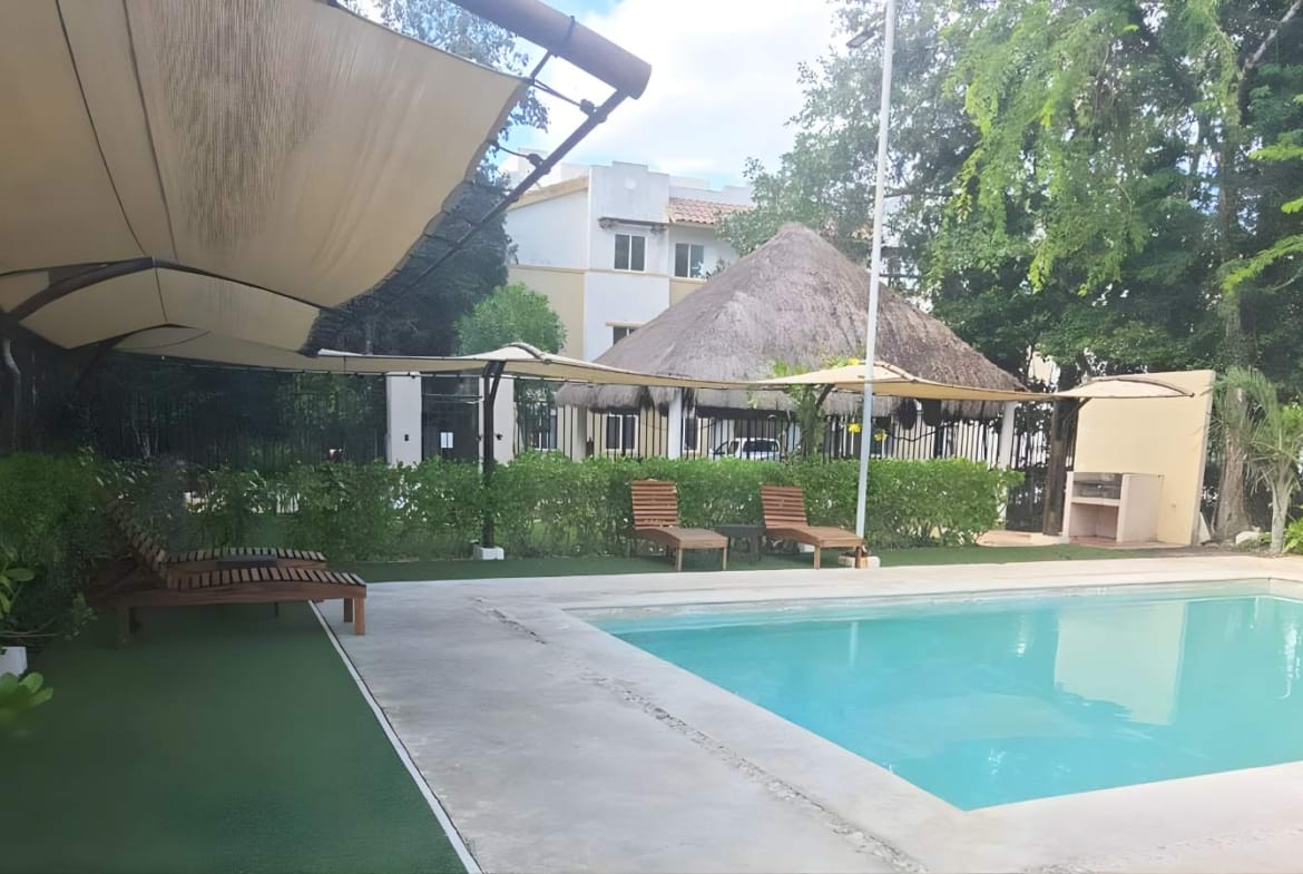 El condominio integra alberca y áreas de esparcimiento con palapas y camastros—perfectas para convivir, trabajar desde casa con descansos activos o recibir visitas.