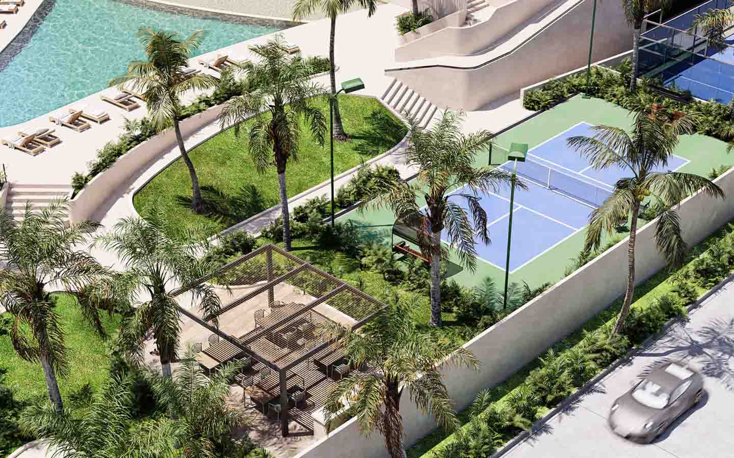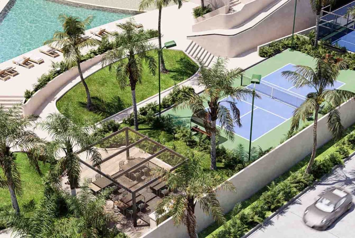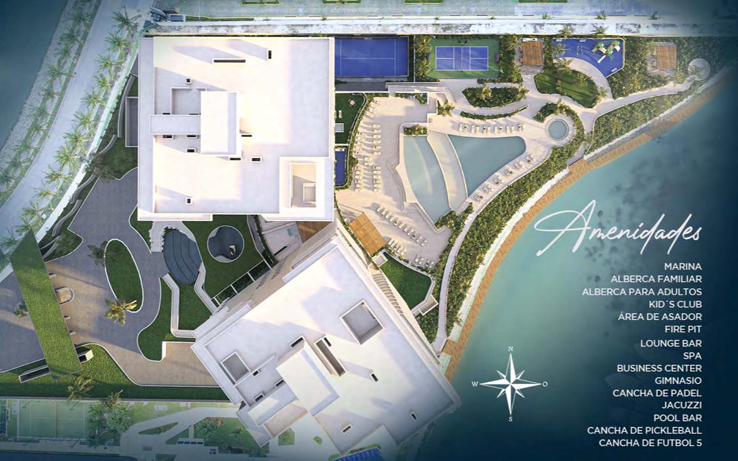 Marina, albercas (familiar y adultos), kid’s club, pet park, spa, gym, business center, pádel, pickleball, fútbol 5, lounge/pool bar, jacuzzi y seguridad 24/7.