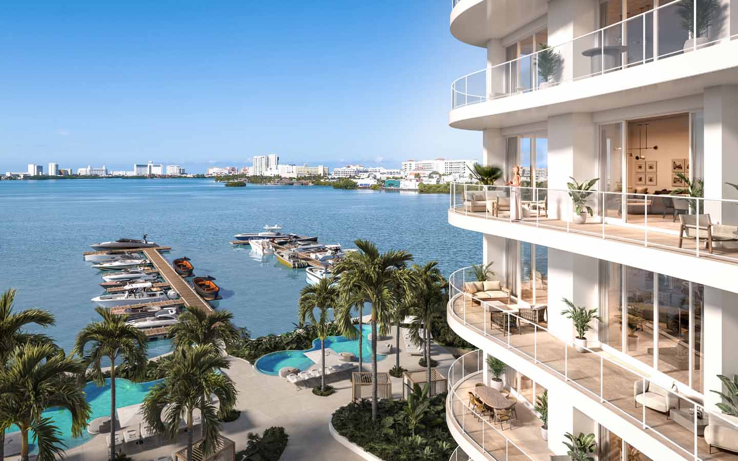 Entrada premium al proyecto: metraje amplio para 1 recámara, ideal como second home con vida náutica.